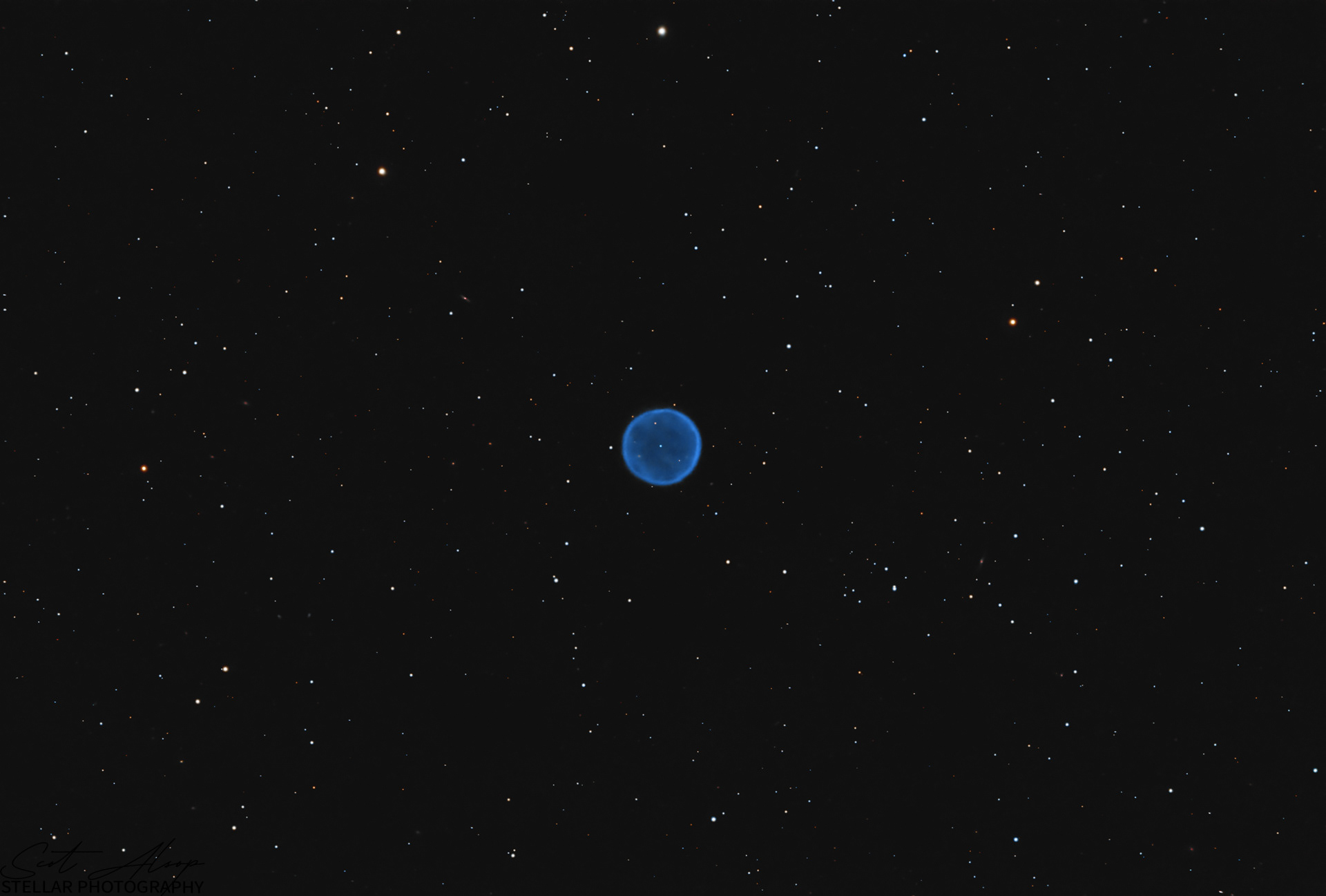 Abell 39 is a low surface brightness planetary nebula in the constellation of Hercules. It is estimated to be about 3,300 light-years from earth and 4,600 light-years above the Galactic plane. It is almost perfectly spherical and also one of the largest known spheres with a radius of about 1.3 light-years. Its central star is slightly west of center by about 2″ or 0.1 light-years. This offset does not appear to be due to interaction with the interstellar medium, but instead, it is hypothesized that a small asymmetric mass ejection has accelerated the central star. The mass of the central star is estimated to be about 0.61 M with the material in the planetary nebula comprising an additional 0.6 M. This planetary nebula has been expanding for an estimated 22,100 years. Oxygen is only about half as abundant in the nebula as it is in our own sun. This was captured from my backyard on 19-20 July 2022.