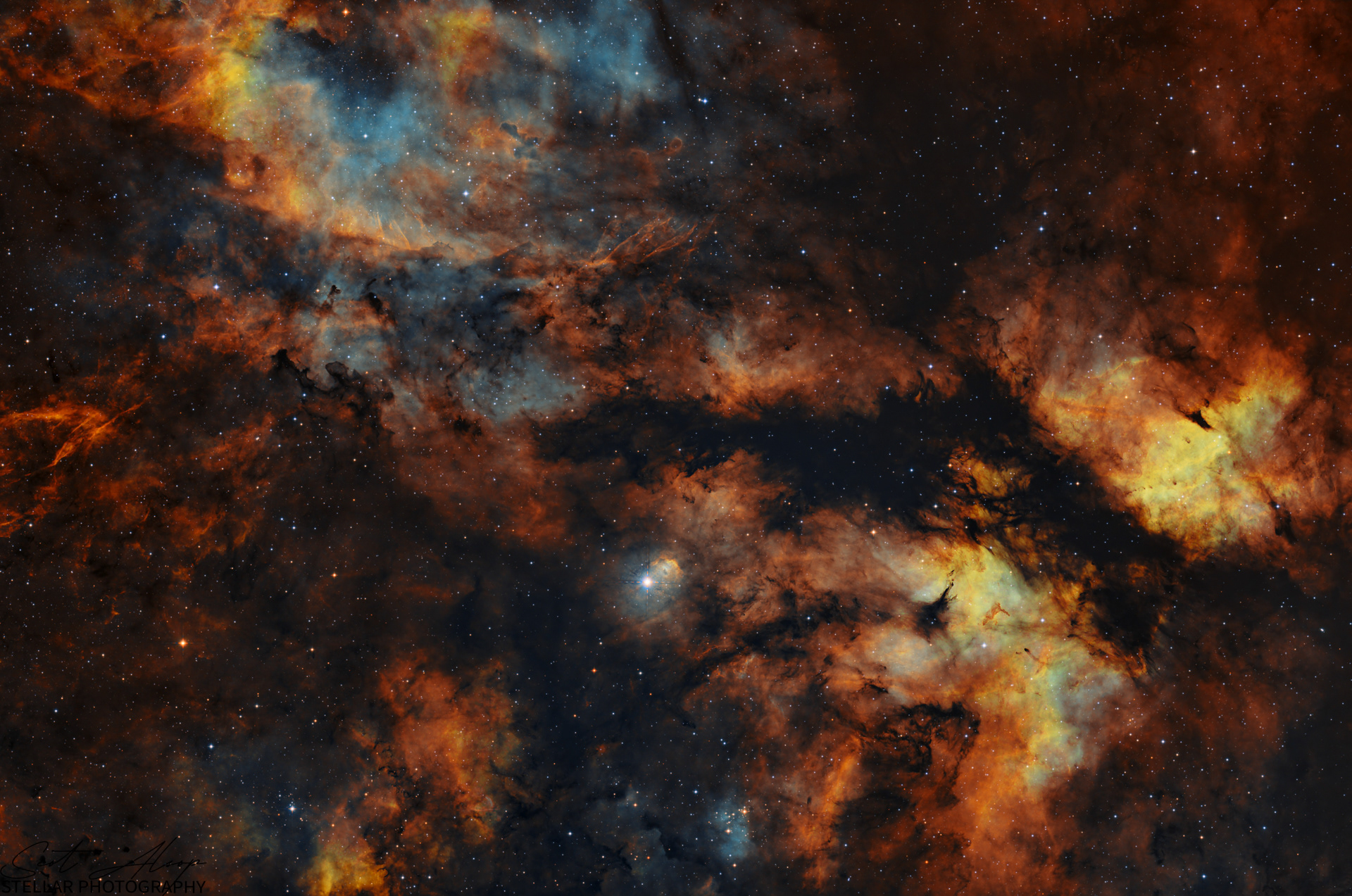 IC 1318 is the diffuse emission nebula surrounding the star Sadr at the center of the Cygnus cross. The Sadr Region is just one of the star's surrounding nebulous regions; others include the Butterfly Nebula and the Crescent Nebula (not seen in this photo). It contains many dark nebulae in addition to the emission diffuse nebulae. Sadr, the brightest star in this image, has a magnitude of 2.2 (very bright) and is about 1,800 light years away. The nebulous regions around the region are also fairly bright. This image was captured over three nights from my backyard during the summer of 2025.