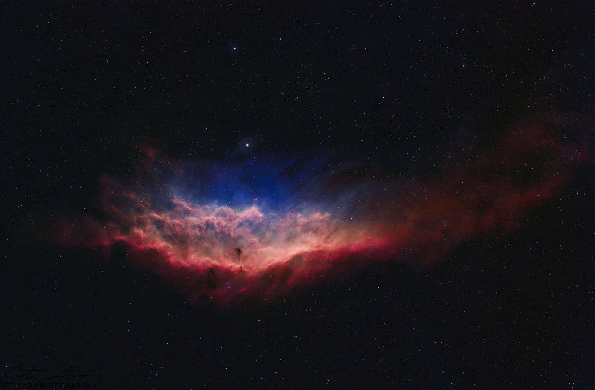 This is an emission nebula located 1,000 light years away from us in the constellation Perseus. It earned it's name due to it's resemblance to the US State. Its fluorescence is probably due to ionization of Hydrogen in the nebula by the nearby very energetic O-star (Massive, luminous, blue star of spectral type O) Menkib seen at center above in my picture. This image was captured over 6 days, with over 57 hours of data, in 2023 and 2024 using a small 2 inch refractor telescope.