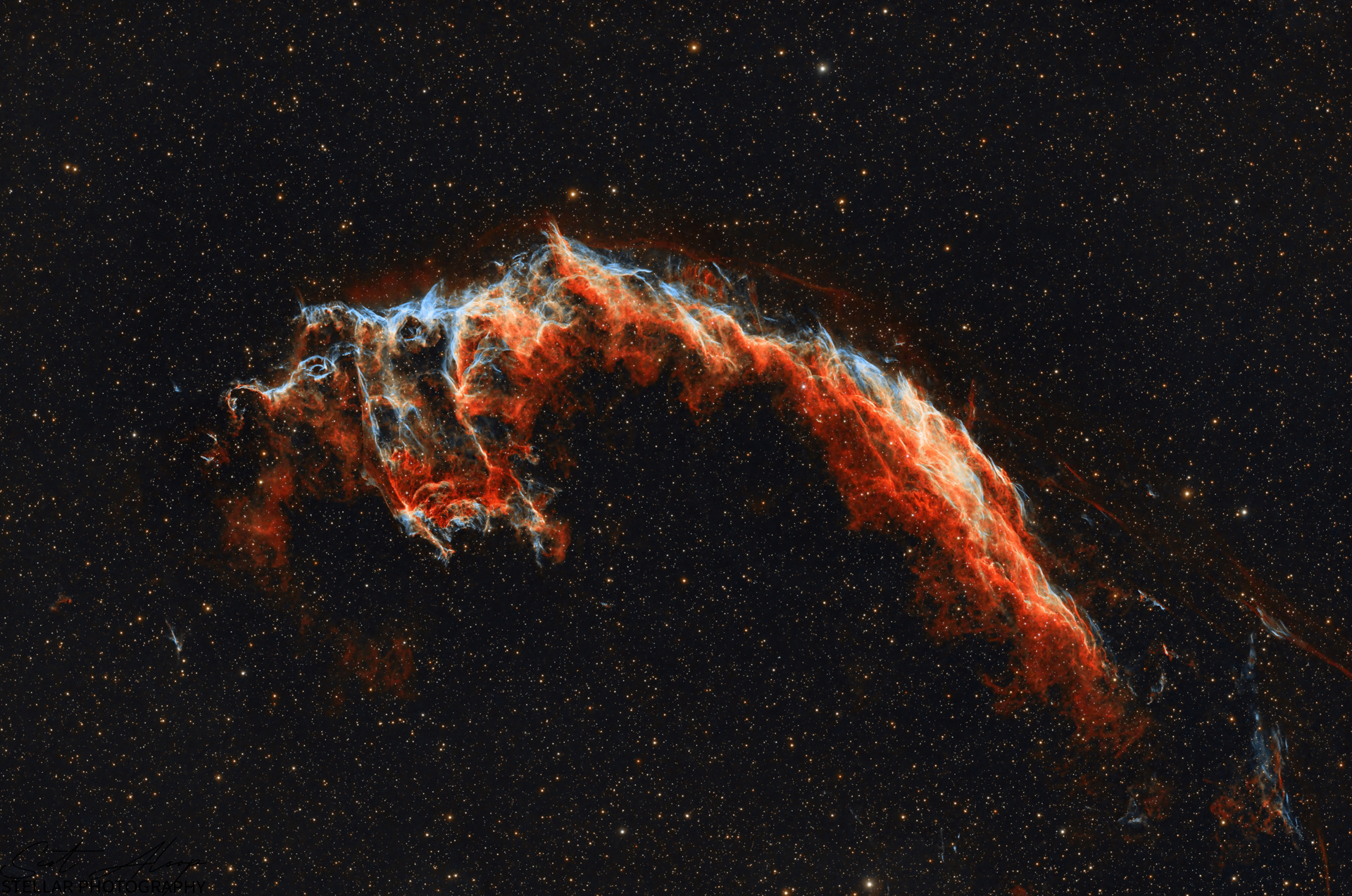 The Eastern Veil Nebula, also known as Caldwell 33, is a large supernova remnant in the constellation Cygnus that is about 2,400 light years from Earth. It is an expanding cloud created by a supernova from a star about 20 times the mass of our sun. Scientists believe that the light from this supernova explosion reached Earth about 10,000 to 20,000 years ago.