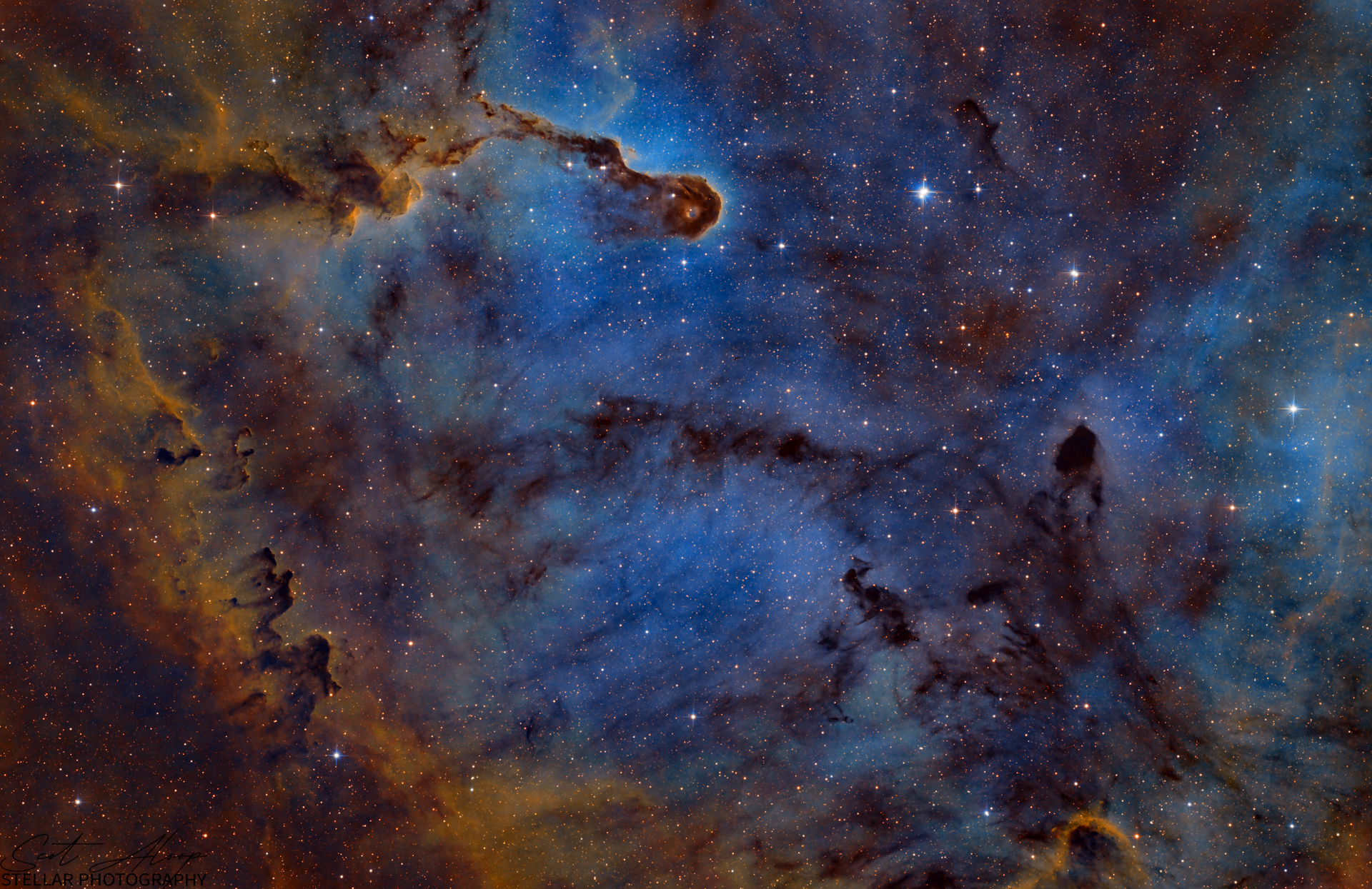 Another capture of the this nebula. It is over 20 light years long and runs through IC1396, a young star cluster located in a cloud of glowing, ionized gas in the Cepheus constellation. The Elephant's Trunk is composed of cool interstellar dust and gas, which blocks the light on its way to Earth and leaves behind a long, thin silhouette that gives the nebula its name. The IC 1396 star cluster is located about 3,000 light years away.