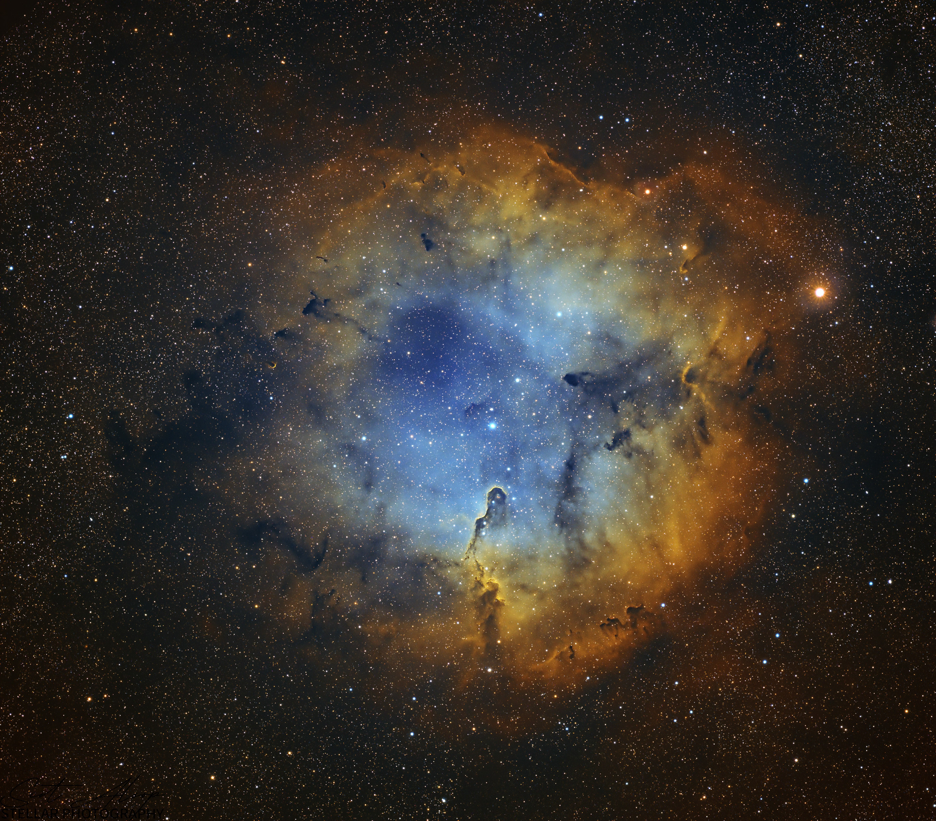 The Elephant's Trunk Nebula is a concentration of interstellar gas and dust within the much larger ionized gas region IC 1396, located in the constellation Cepheus about 2,400 light years away from Earth. The Elephant's Trunk Nebula is now thought to be a site of star formation, containing several very young (less than 100,000 yr) stars that were discovered in infrared images in 2003. Two older (but still young, a couple of million years, by the standards of stars, which live for billions of years) stars are present in a small, circular cavity in the head of the globule. Winds from these young stars may have emptied the cavity. The combined action of the light from the massive stars ionizing and compressing the rim of the cloud, and the wind from the young stars shifting gas from the center outward lead to very high compression in the Elephant's Trunk Nebula. This pressure has triggered the current generation of protostars.
