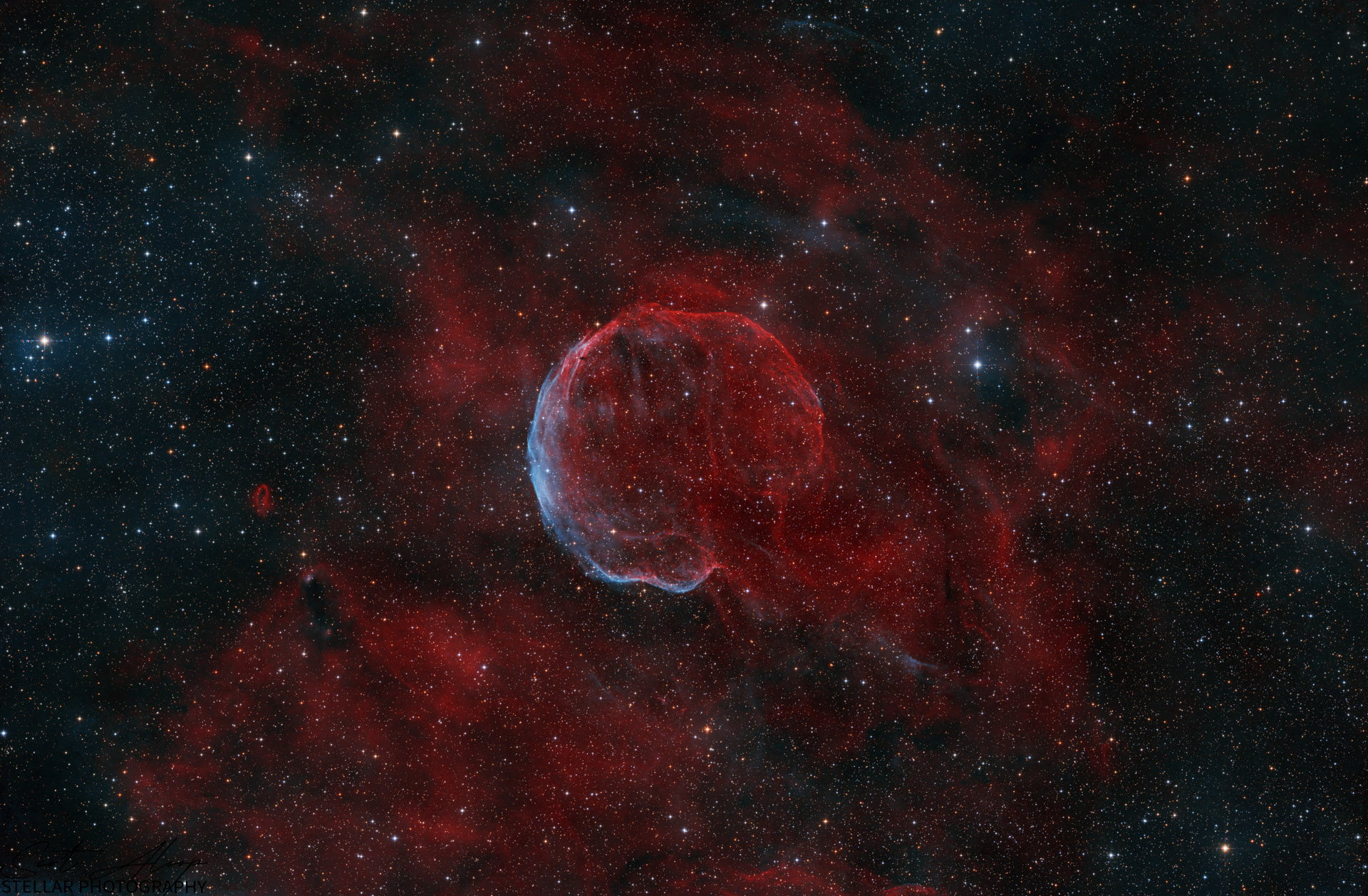 Estimated to have formed about 10,000 years ago, it is believed that the source of this supernova remnant is now a very fast moving Pulsar (J0002). Interestingly, the pulsar was detected outside the bubble of the nebula, meaning that during the SN, it was sent careening away fast enough to overtake the expanding cloud of gas and dust.