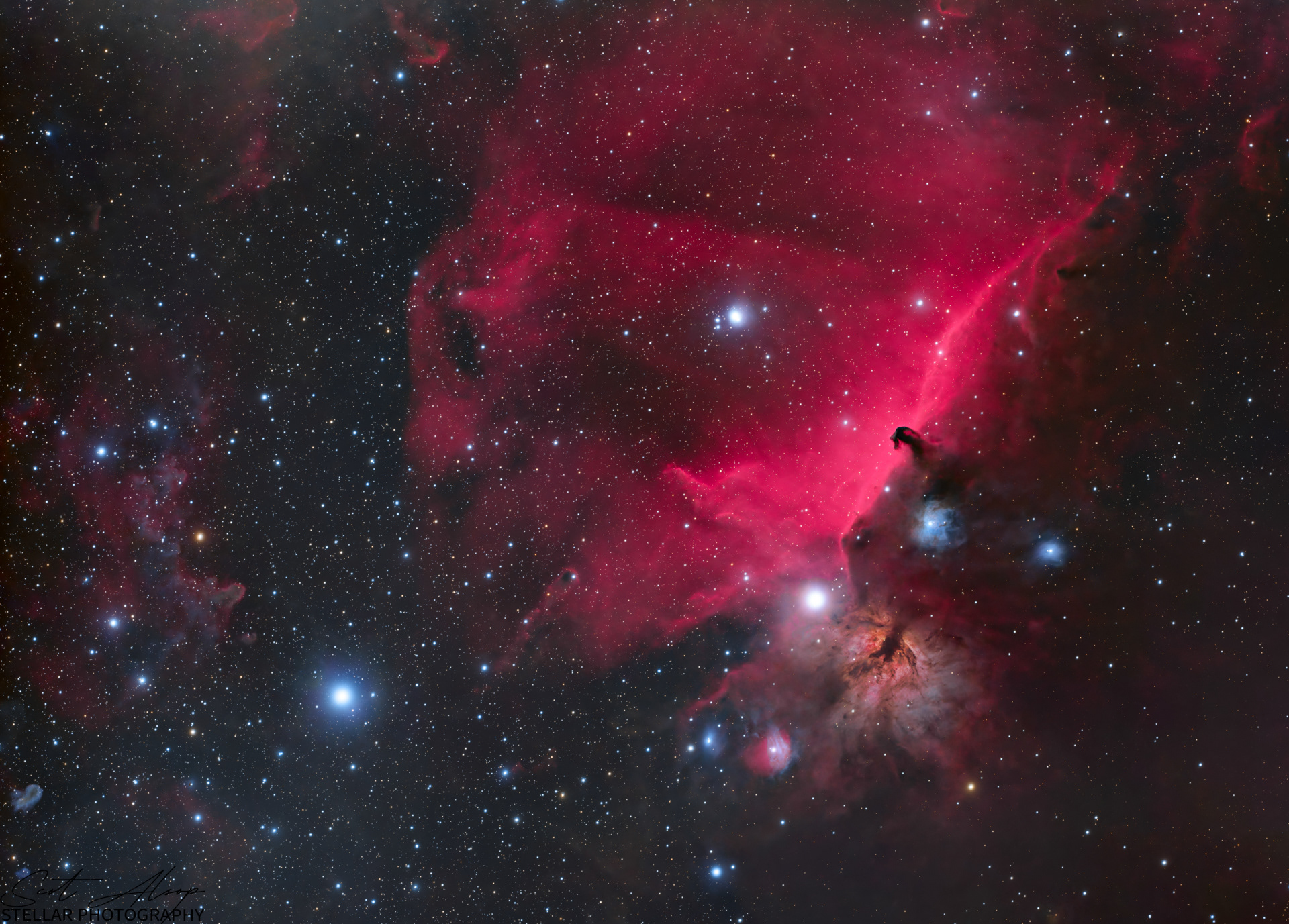 The Horsehead and Flame Nebula (IC434) Located on the easternmost part of Orion's belt, these nebula lie approx 1375 light-years from earth and are connected (in our view) by the star Altinak. At the center of the Flame Nebula is a cluster of newly formed stars, 86% of which have circumstellar disks. This image was captured over several nights in January 2026 with 14 hours of RGB color data blended with 4 hours of Hydrogen Alpha emissions data. I combined the RGB data with the Ha data to bring out greater detail in the nebula.