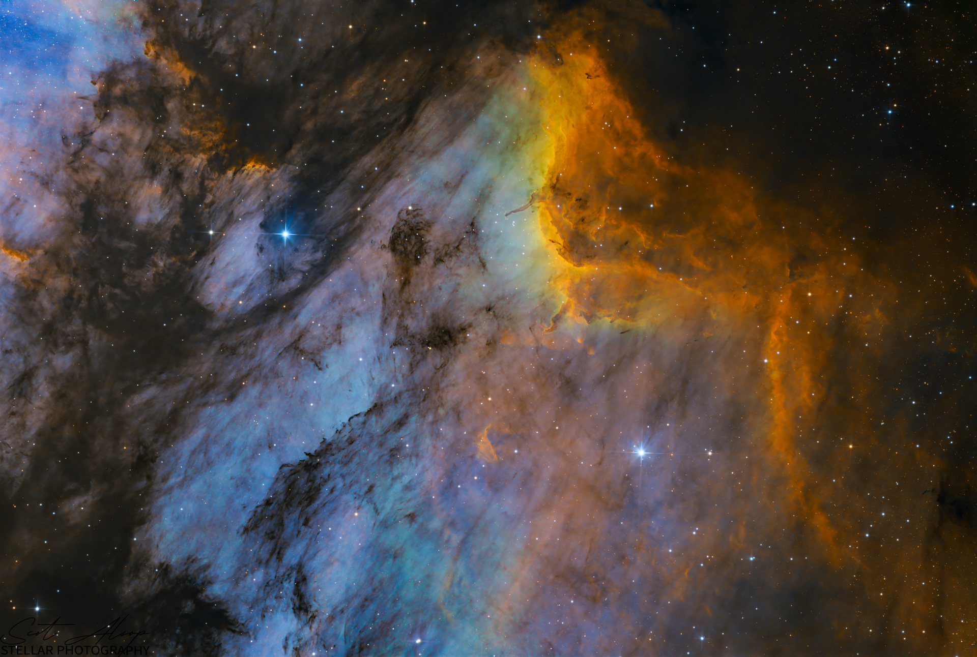 This is an area of interstellar hydrogen that is ionized. It is associated with the North America Nebula in the constellation Cygnus. The Pelican is studied because it has a very active mix of star formation and evolving gas clouds. The light from young energetic stars slowly transforms cold gas to hot causing an ionization front to gradually move outward. In the upper middle of this picture, you can see filaments of cold gas that still remain. The Pelican is about 1,800 light years from earth. This image was captured over 4 days in June 2025 with a 10 inch Newtonian telescope.