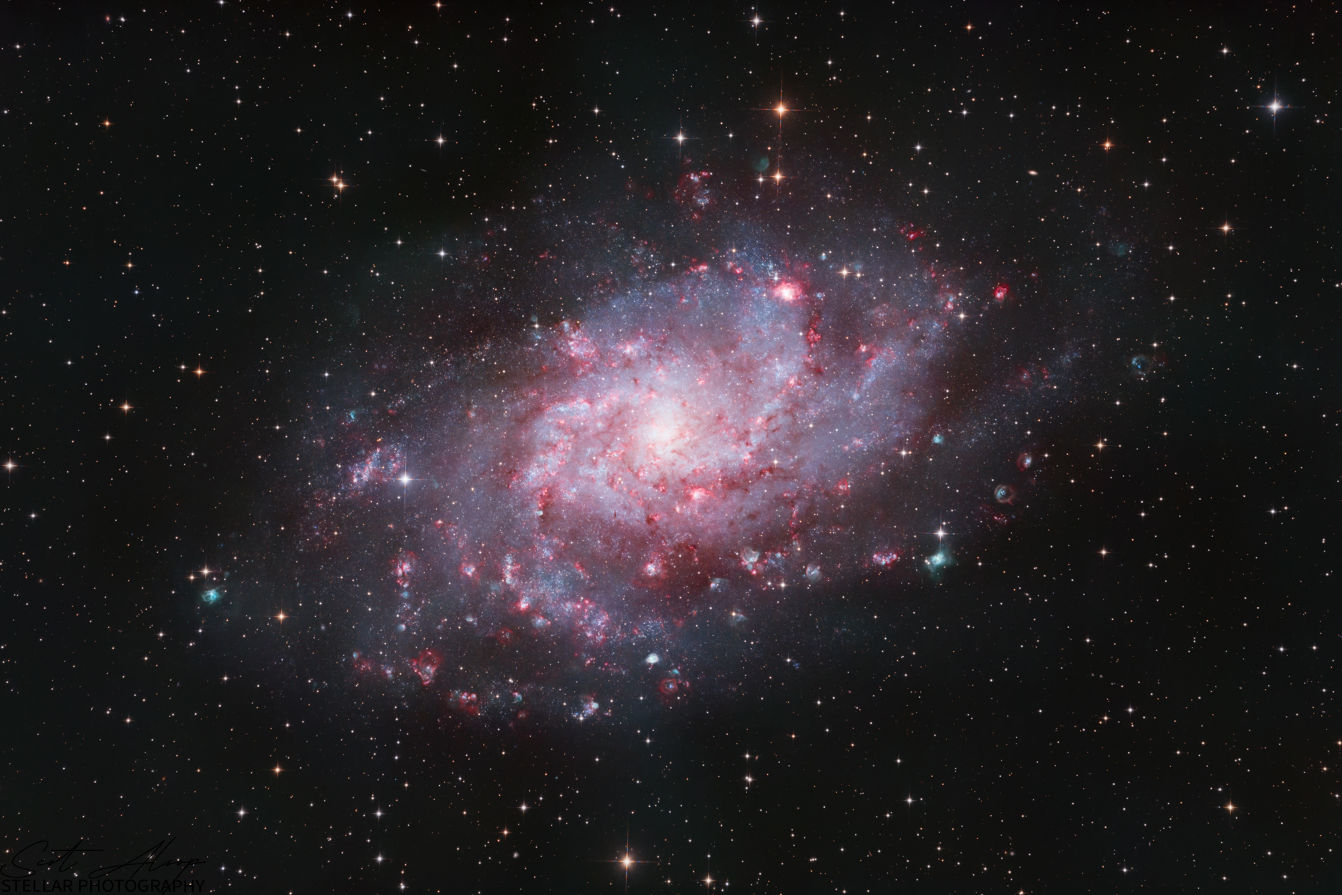 The Triangulum Galaxy - M33 Over 30 hours of standard RGB image data captured and blended with over 7 hours of Hydrogen and Oxygen gas cloud emissions data. This spiral galaxy is 2.73 million light-years from Earth and can be located in the Triangulum constellation. This galaxy is the third largest of the local group of galaxies (behind Andromeda and the Milky Way) and is one of the most distant objects that can be seen with the naked eye. It is roughly 60,000 light-years across and is roughly 60% of the diameter of the Milky Way. It is estimated to contain approximately 40 billion stars, whereas the Milky Way and Andromeda are estimated to have 400 billion and 1 Trillion respectively.