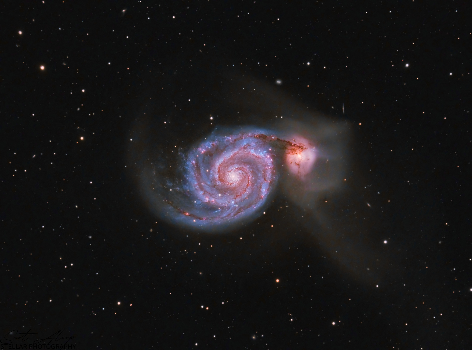 Located 21 million light years away in the constellation Canes Venatici (just below the handle of the big dipper). This was the first galaxy to be classified as a "spiral" galaxy. Estimated diameter is 76,000 light years with a mass of approx 10% of the milky way galaxy. M51 is also known as NGC 5194 and can be seen interacting with NGC 5195, a dwarf galaxy. These two are the most famous of interacting galaxy pairs.