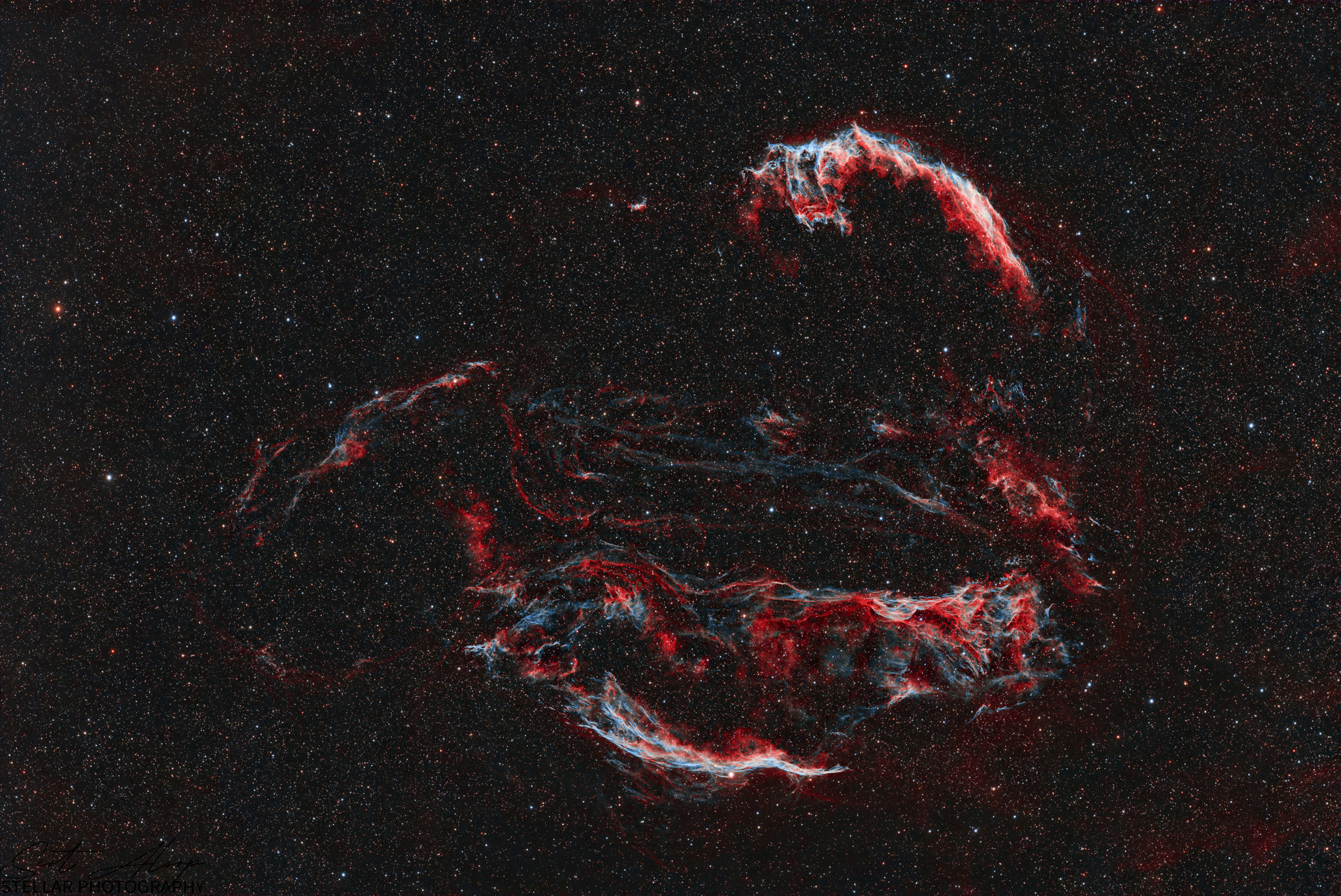 There are three main components of the Veil Nebula. The western veil (center bottom of image), the eastern veil (top, just right of center), and Pickering's Triangle (large nebula between the other two), which was discovered by Williamina Fleming, but credit was given to her observatory directory, Edward C Pickering. The source of the nebula was a Supernova explosion of a star 20 times as massive as our own Sun. Estimates are that the star exploded 10,000 to 20,000 years ago. The supernova, had we seen it, would have been brighter to us than Venus. Estimated distance to this nebula is 2,400 light years. The whole nebula is approx 65 light years across and from our perspective, if compared in size to the moon, would be 6 times wider/taller. Image was captured over 3 nights in Sep/Oct 2023 using a small 51mm refractor telescope.