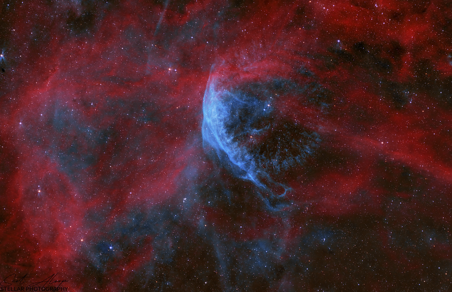 WR 134 is a Wolf-Rayet (WR) type star 6,000 light years distant in the constellation Cygnus. WR stars are rare, extremely hot, and massive stars (often 20-50x mass of our sun) nearing the end of their lives and characterized by intense stellar winds and high mass loss. They are known for shedding outer hydrogen layers to reveal heavier elements like helium, carbon, or nitrogen. This star is surrounded by a faint bubble nebula created by the intense radiation and stellar winds from the star. The star is the of the four central stars near the center of the bubble. WR134 is extremely hot at 63,000K and is 400,000 times as luminous as our sun. In this image the bubble is shown in doubly ionized oxygen light (OIII) as the round blue area with a stronger signal from the left hand side. Also the area is full of Hydrogen (HII) emission shown as the red clouds of gas.